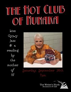 Book 2 just came out in June and will be presented to The Writer’s Block, and then Betty’s son Hans will be playing with The Hot Club of Nunaka (gypsy jazz).